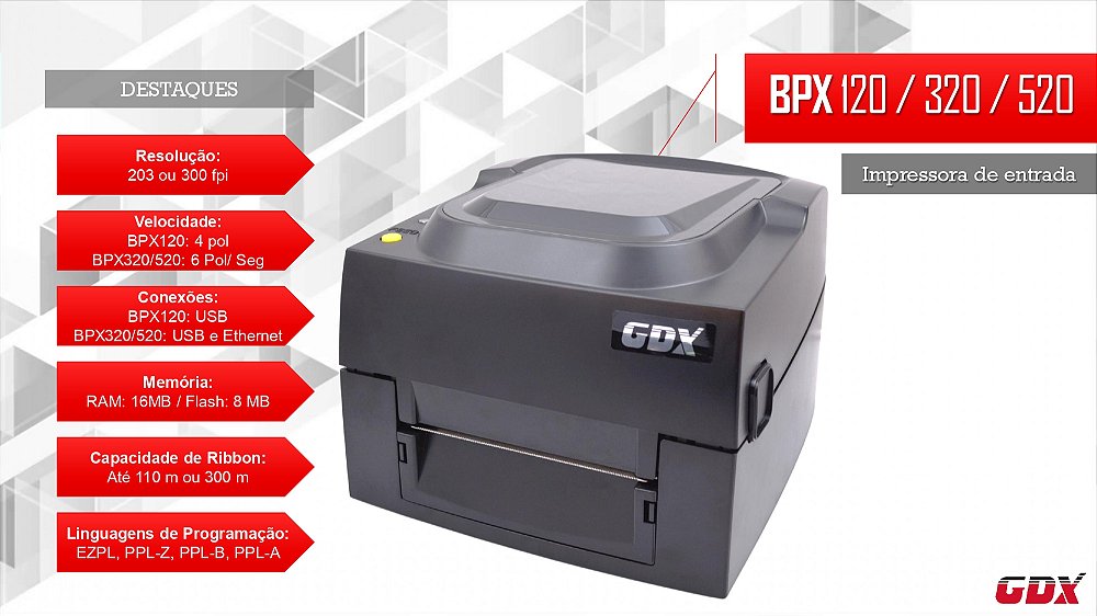 A GDX BPX-520 é a impressora definitiva para quem busca alta performance e robustez em ambientes industriais ou de grande movimentação. Perfeita para quem não pode perder tempo!